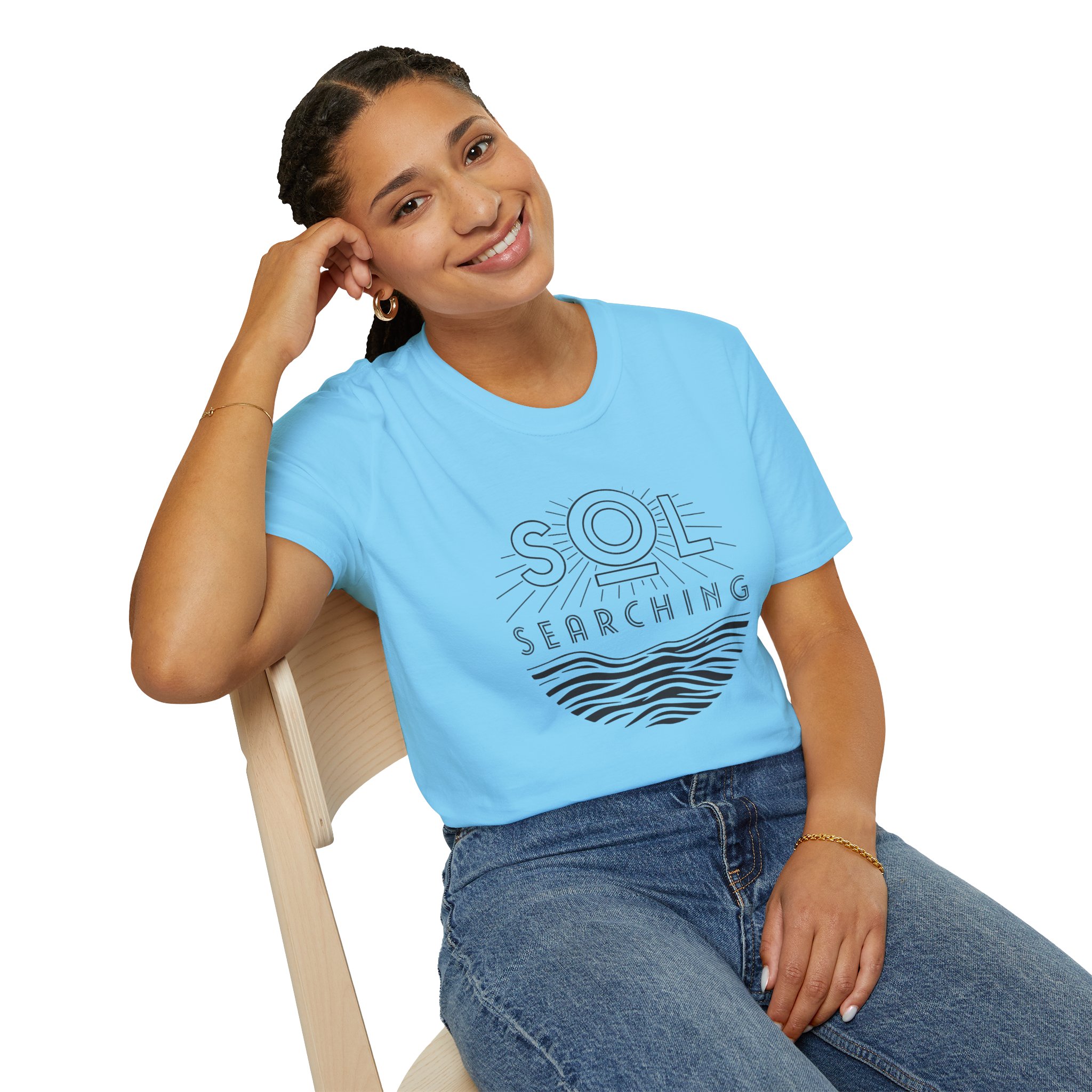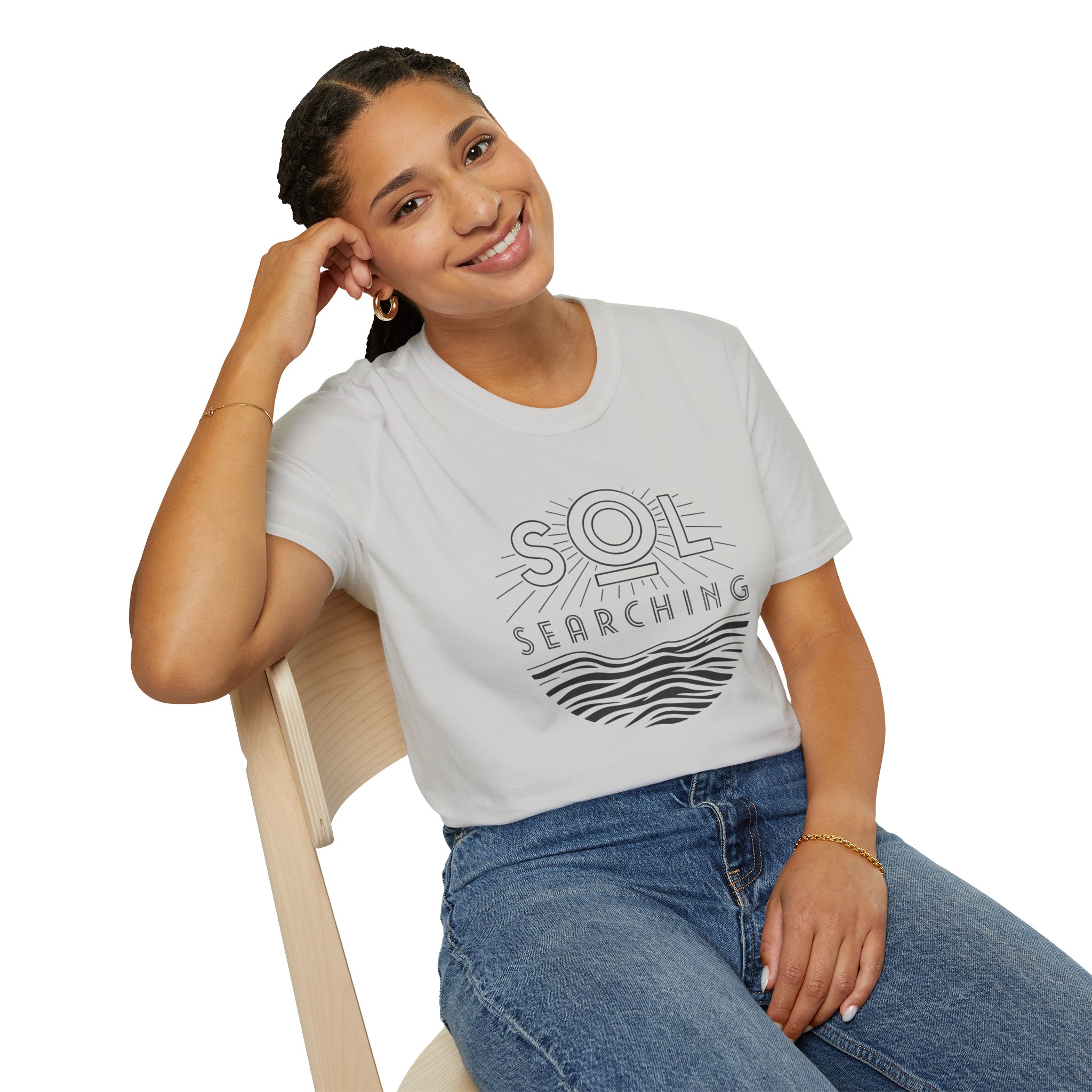 Original “Sol Searching” artwork: Features bold sun rays, art deco-inspired lettering, and flowing ocean waves for a minimal, meaningful look